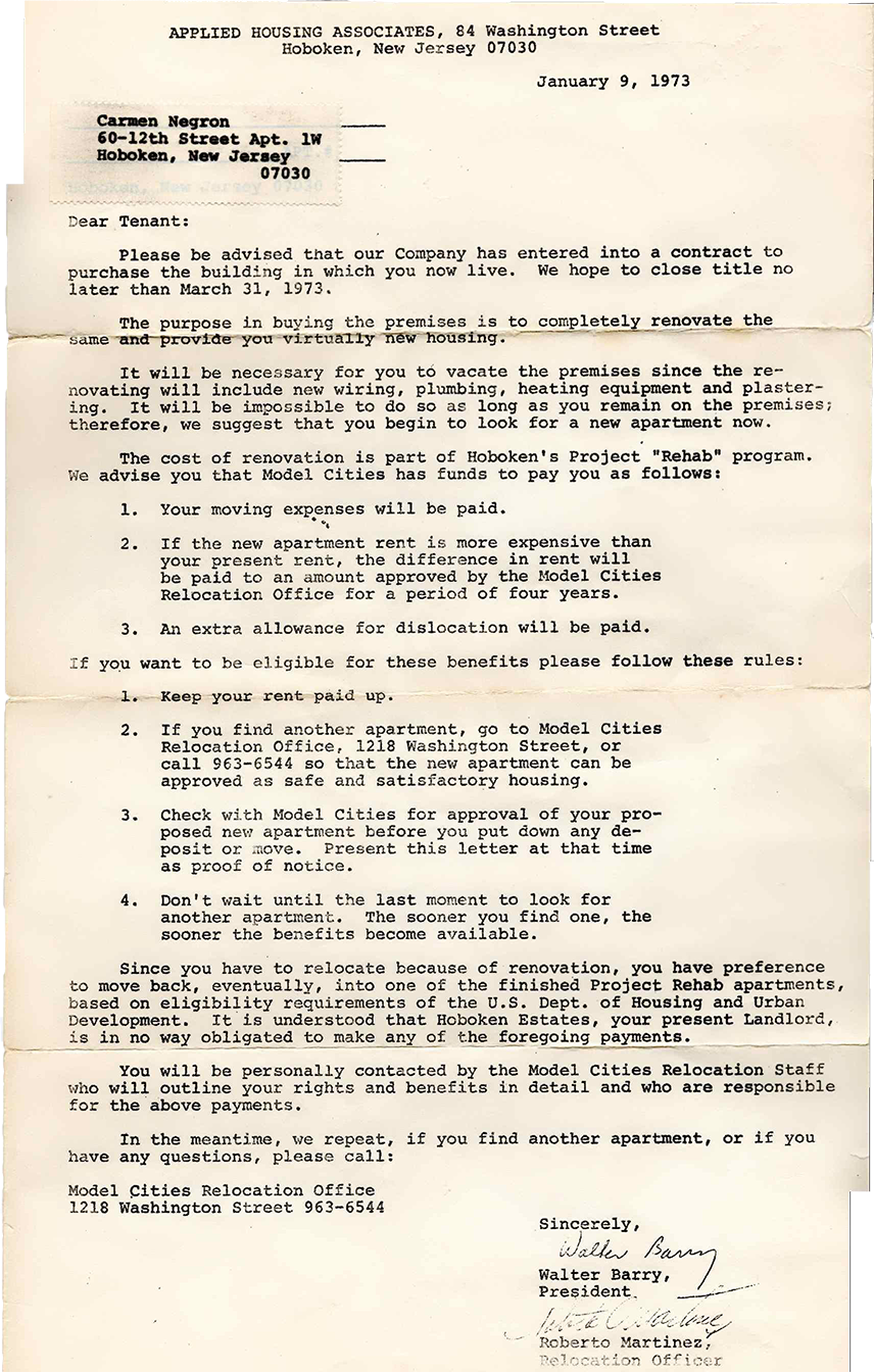 Chicky: I could tell you that my mom told me stories about before. Years before they decided they were going to do what they did because they already had it in the plan. In Hoboken’s headquarters. It was called Model City. And, this one insider that was acquaintance with my mom, told my mom, I think he was a realtor. You should purchase property because this and this is gonna happen. It’s gonna happen. It’s in the plan. But, you know, for some reason, my mom didn’t do that. She didn’t do that, but, you know, the man was right. What we did know, all those persons…like, if you’re in there, you die. That’s how it went down. And the thing is that no one did anything about it. Everyone looked the other way. Cappiello, everybody, cops, you name it. It was a free for all. This is gonna happen, and nobody’s gonna prosecute anybody. Yeah. It was sad. Very sad.