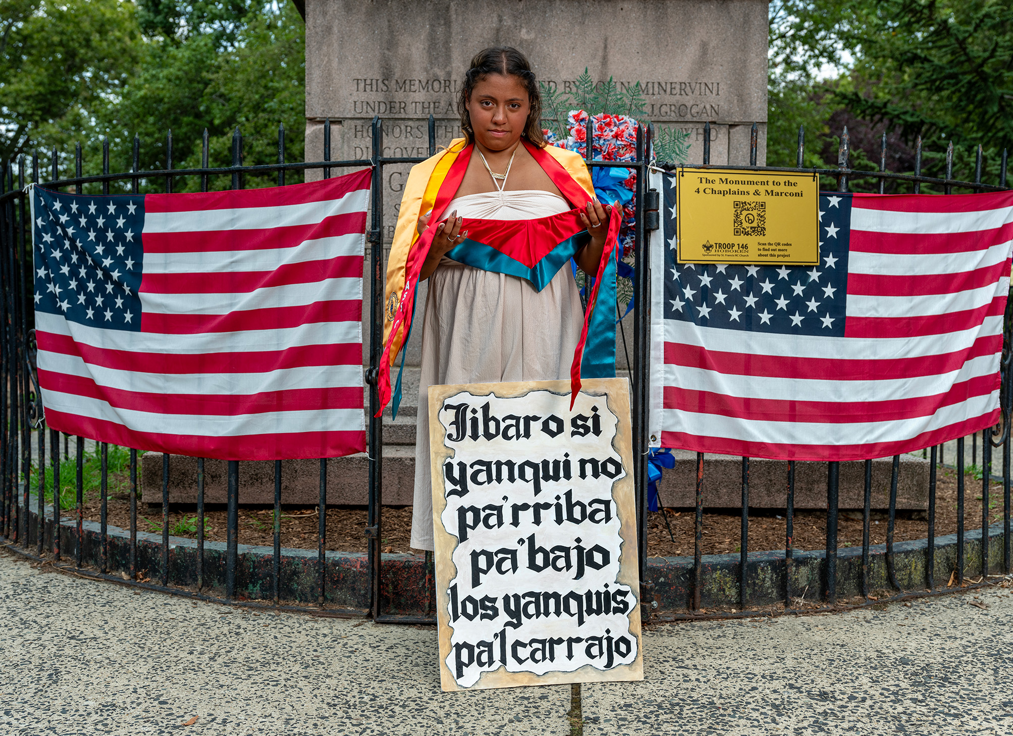 A woman standing between two American flags holding a sign.