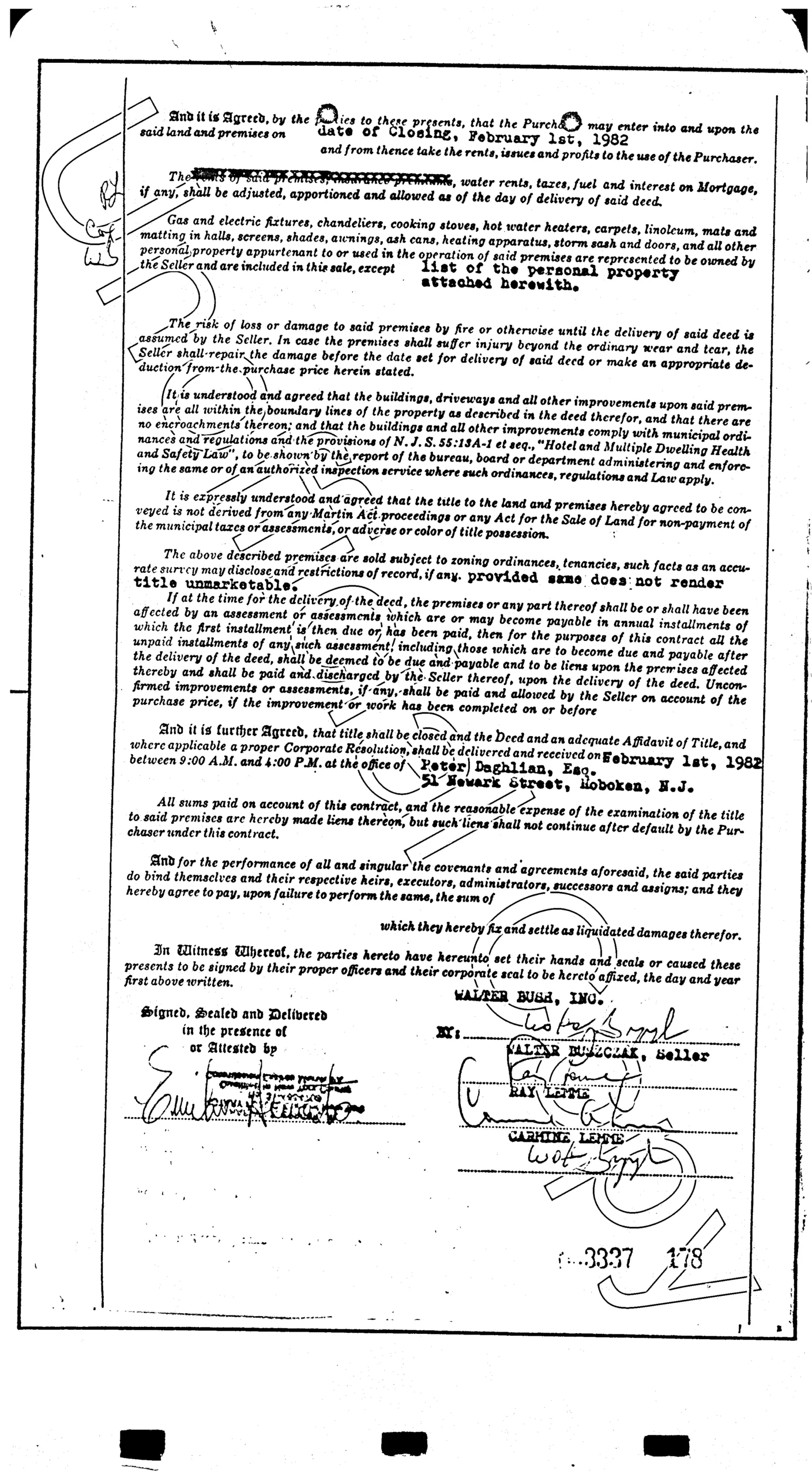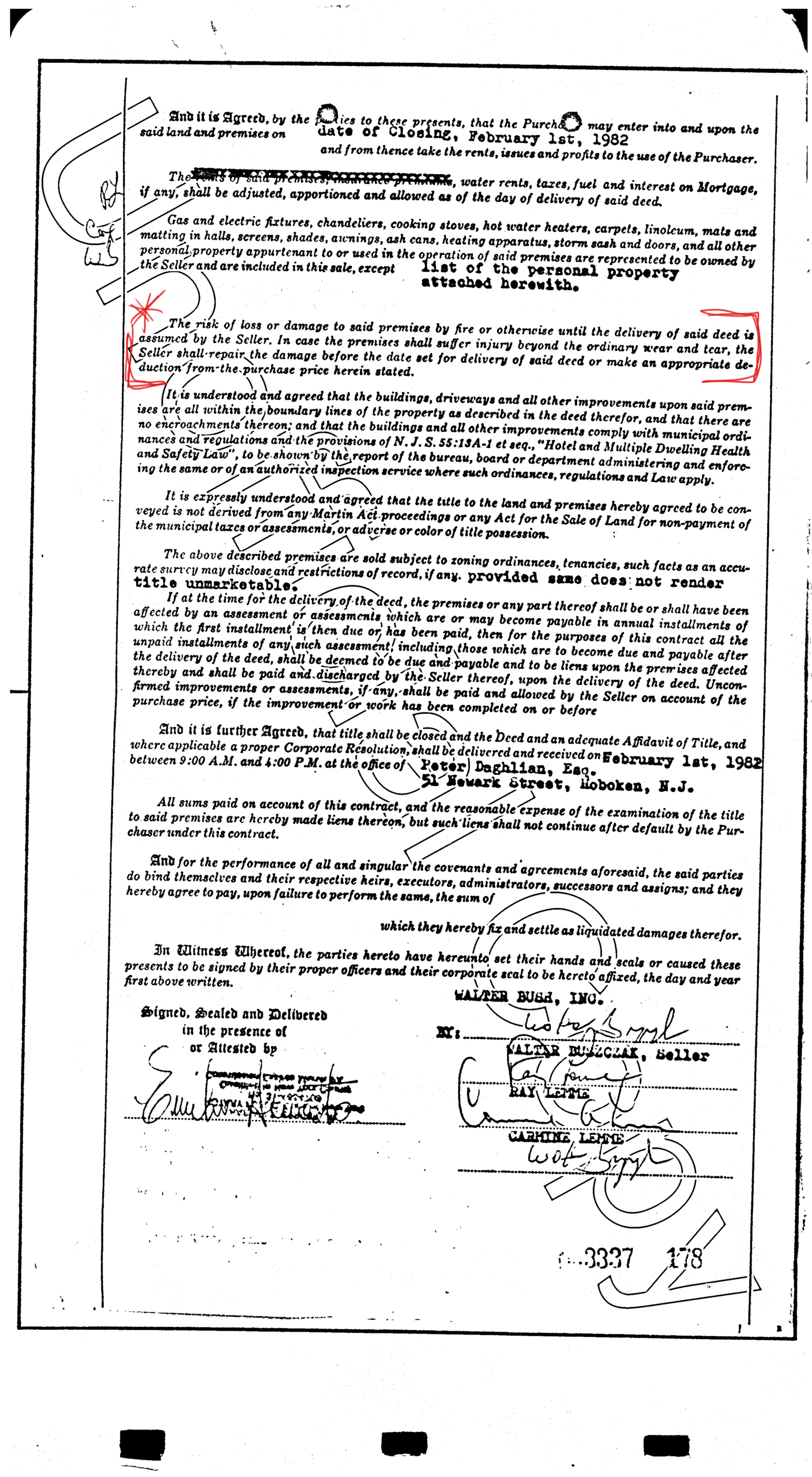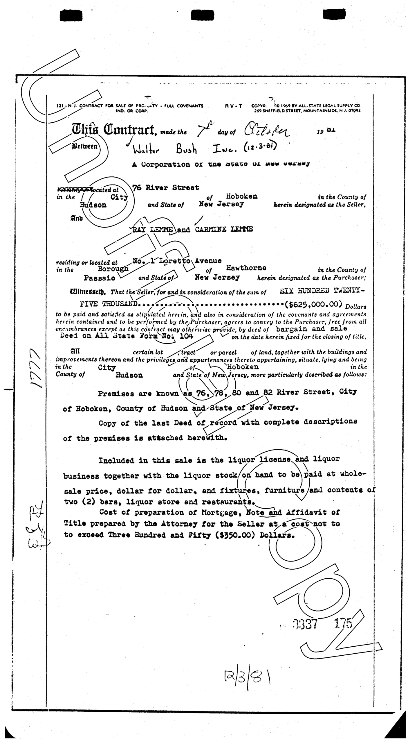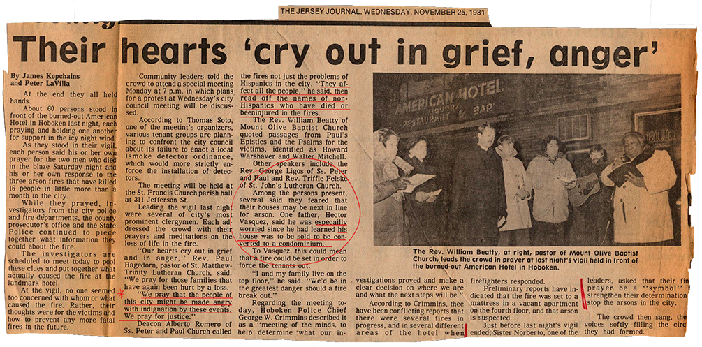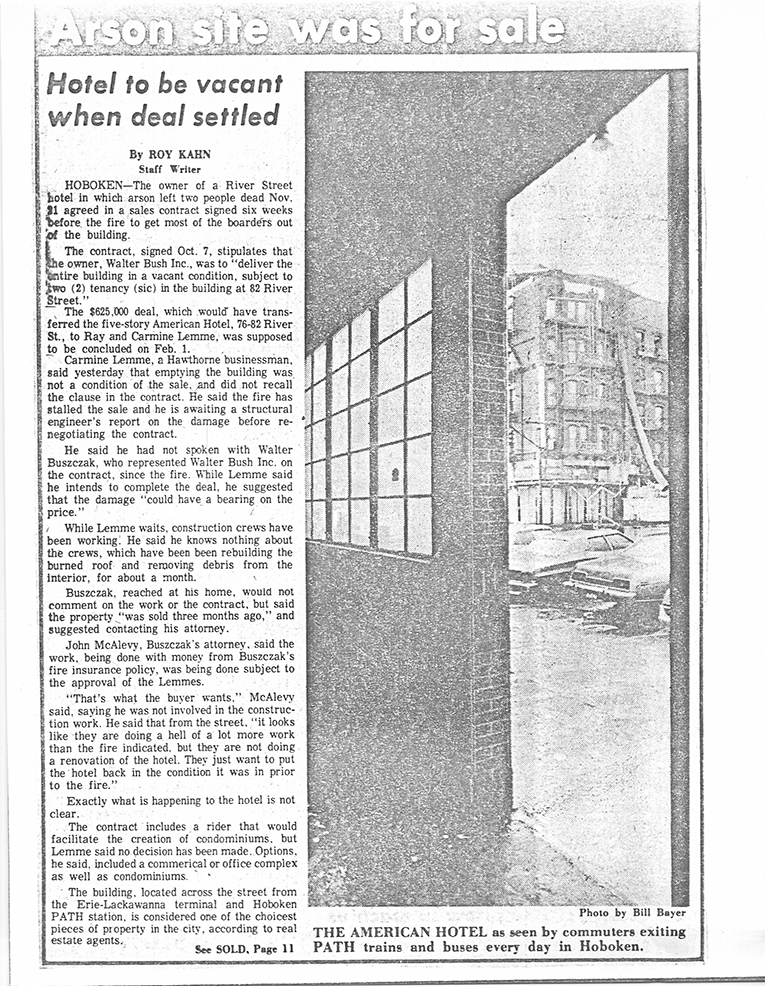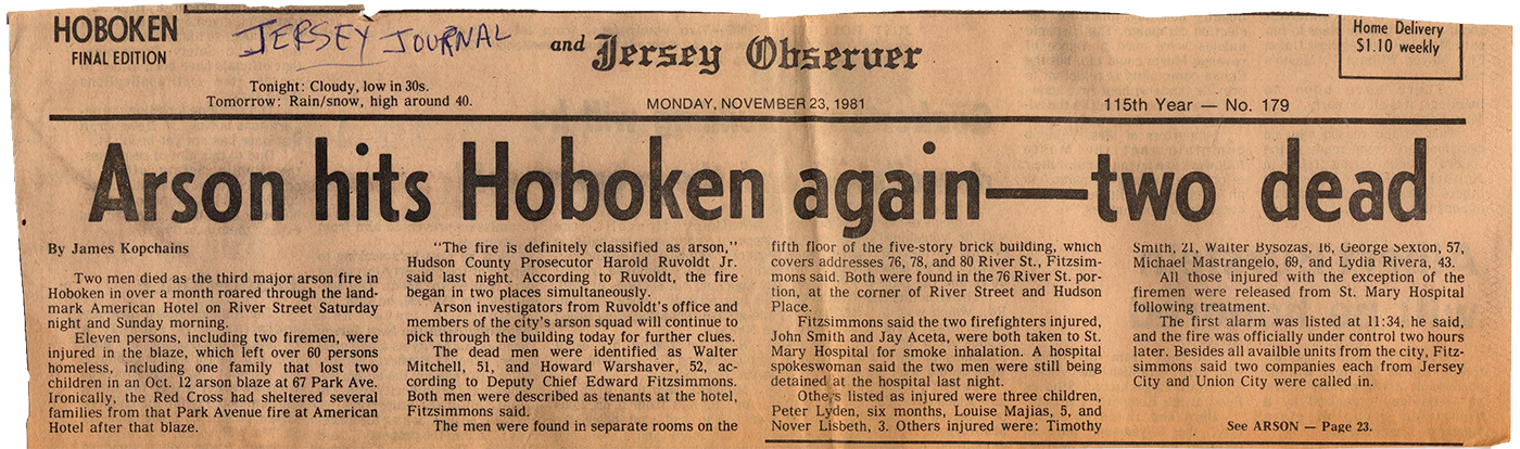 Investigators concluded that arson was the cause of the fire which occurred on Saturday, November 21, 1981, at The American Hotel located at 225 River Street in Hoboken. At the time, the hotel served as a refuge for dozens Hoboken residents who had been displaced by arson fires in the weeks prior. An arson fire at 67 Park Ave on October 12th had taken the lives of two children and another at 1202 Washington Street took the lives of two entire families on October 25th. Among the many families who were sheltered at the American Hotel were the parents of the two boys who died at 67 Park Ave, Modesto Cordero and Carmen Galicia. Two persons were killed in the fire and were identified as Walter Mitchell (51), and Howard Warshaver (52). The documents listed here reveal that the building was in contract to be sold six weeks weeks prior to the fire under the stipulation that the building be delivered vacant.