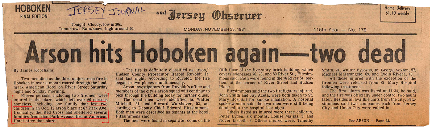 Kopchains, James. “Arson hits Hoboken again – two dead”. The Jersey Journal and Jersey Observer, 23 November 1981, p. 104.