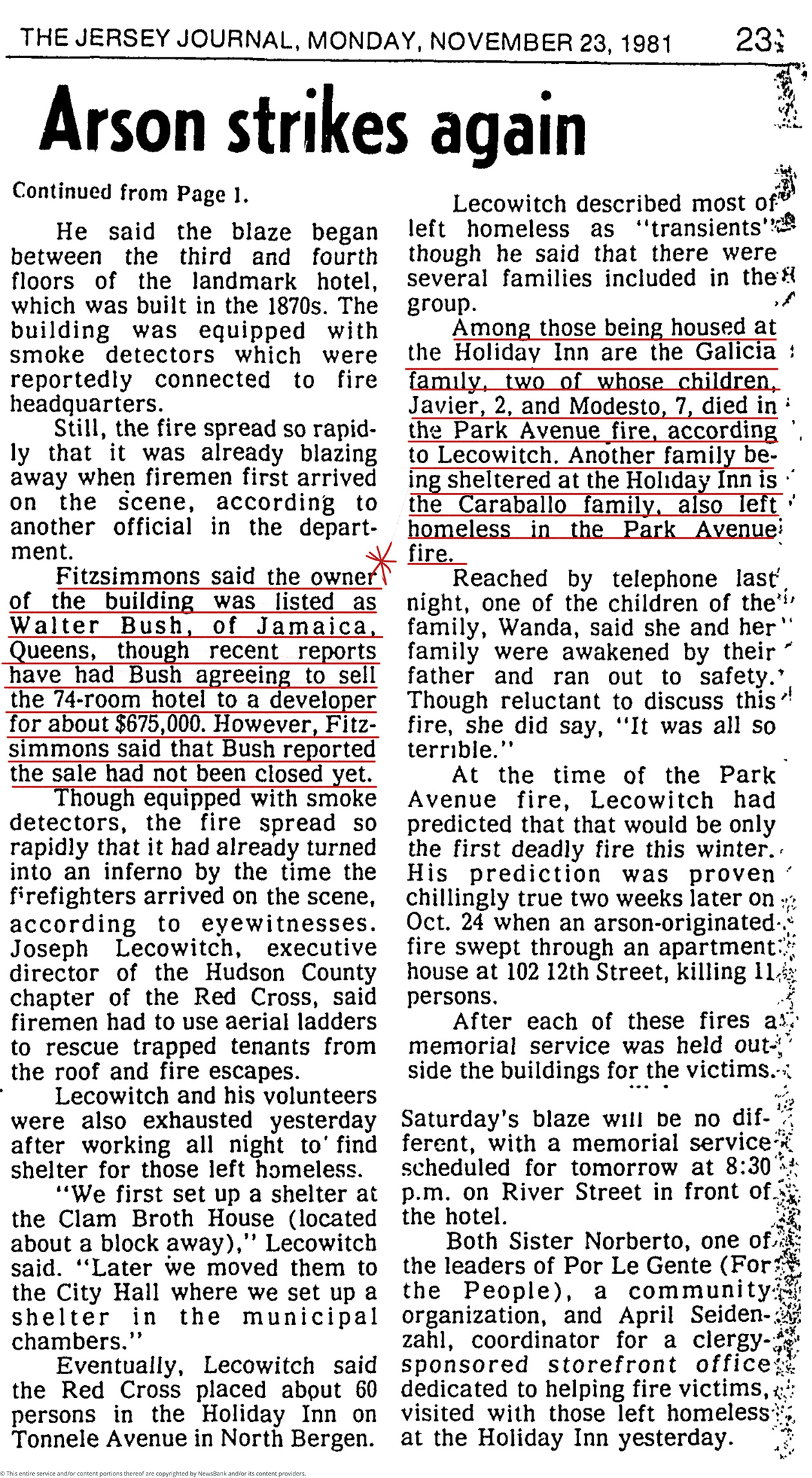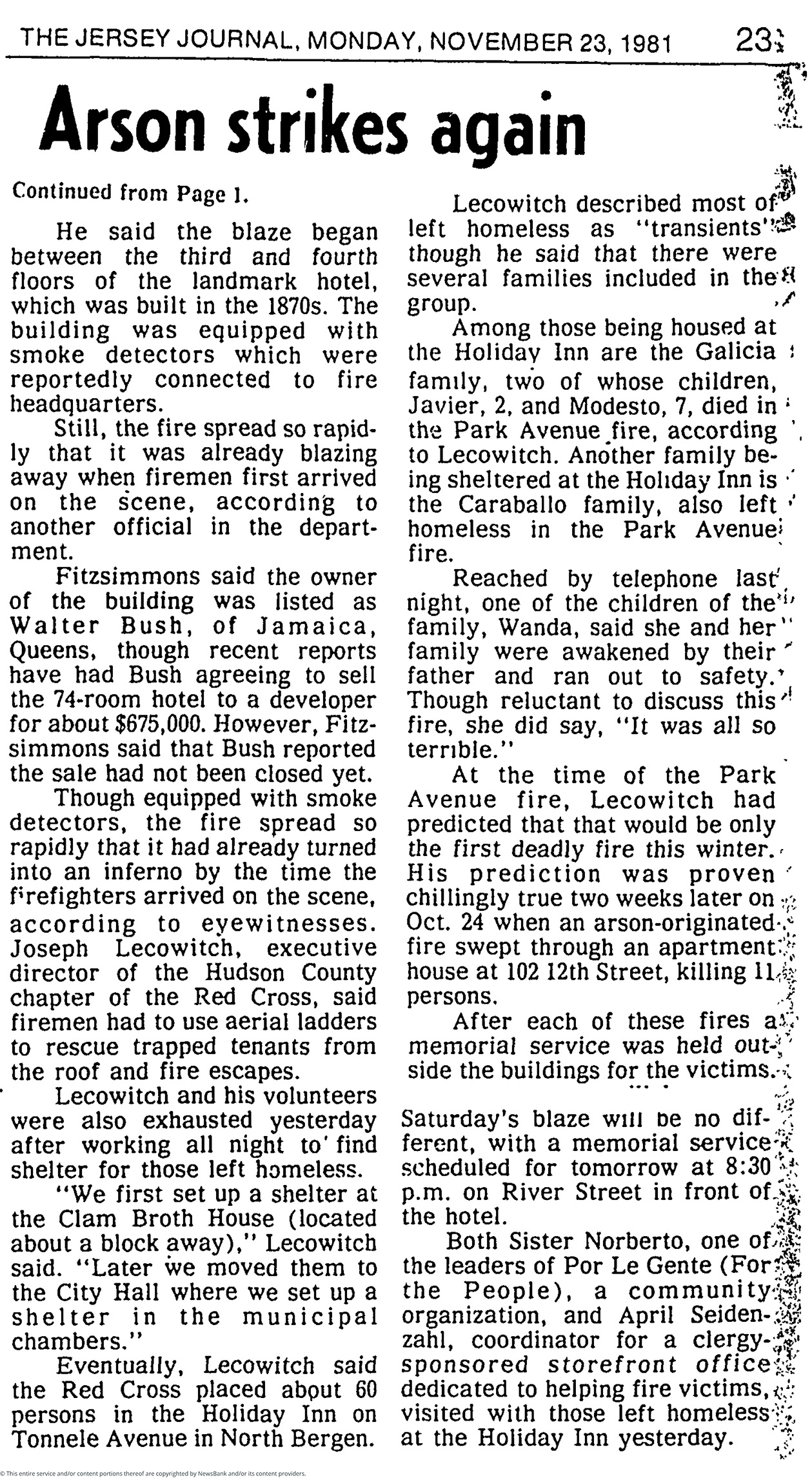 “Arson Strikes Again”. The Jersey Journal, 23 November 1981, p. 23.