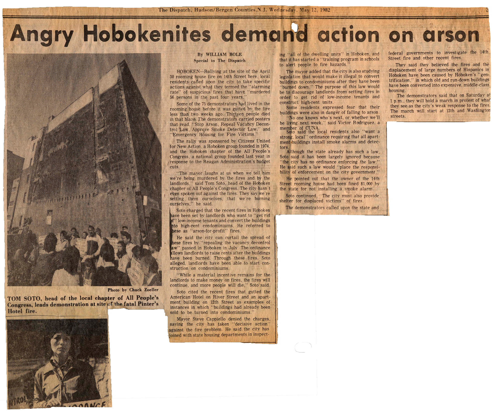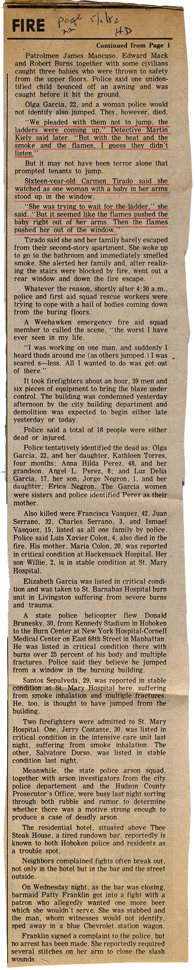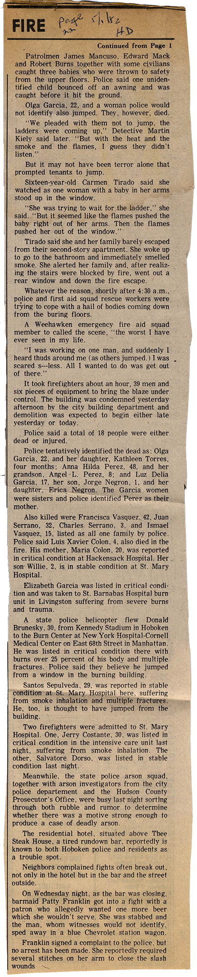 That was not their first fire. It was my second fire and their third fire in Hoboken. I wasn't at the one in Madison Street, the one that happened during the day. It happened right before Easter. But until I saw for my self these news clippings and stuff, that's when I knew. I never knew about the gentrification until eight years ago.